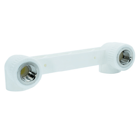 - Design: A twin 90-degree elbow fitting connected by a rigid PP-R bridge, featuring female threaded ends for secure attachment of fixtures such as faucets or mixers.